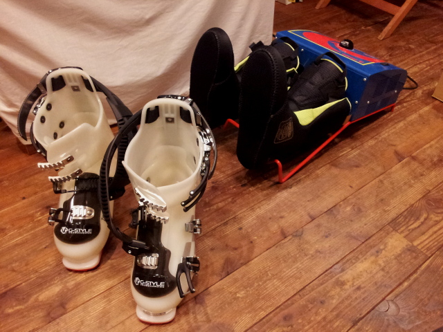ブーツはいてビンディングに固定してみてチェック。